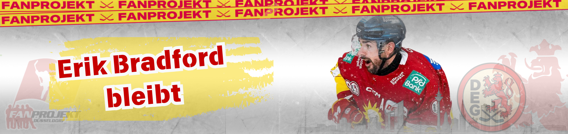 Die Düsseldorfer EG meldet eine weitere Vertragsverlängerung: Stürmer Erik Bradford bleibt eine weitere Saison ein Rot-Gelber! Der 31-jährige Kanadier war im Sommer 2025 aus Schweden nach Düsseldorf gewechselt und hatte in 53 Spielen 17 Tore geschossen sowie 31 Vorlagen gegeben. Zeitweise war er Top-Scorer der DEG. Mehr noch überzeugte er aber mit Teamgeist, Einsatz und Kampfgeist. Der Co-Kapitän war einer der Leader der Mannschaft.